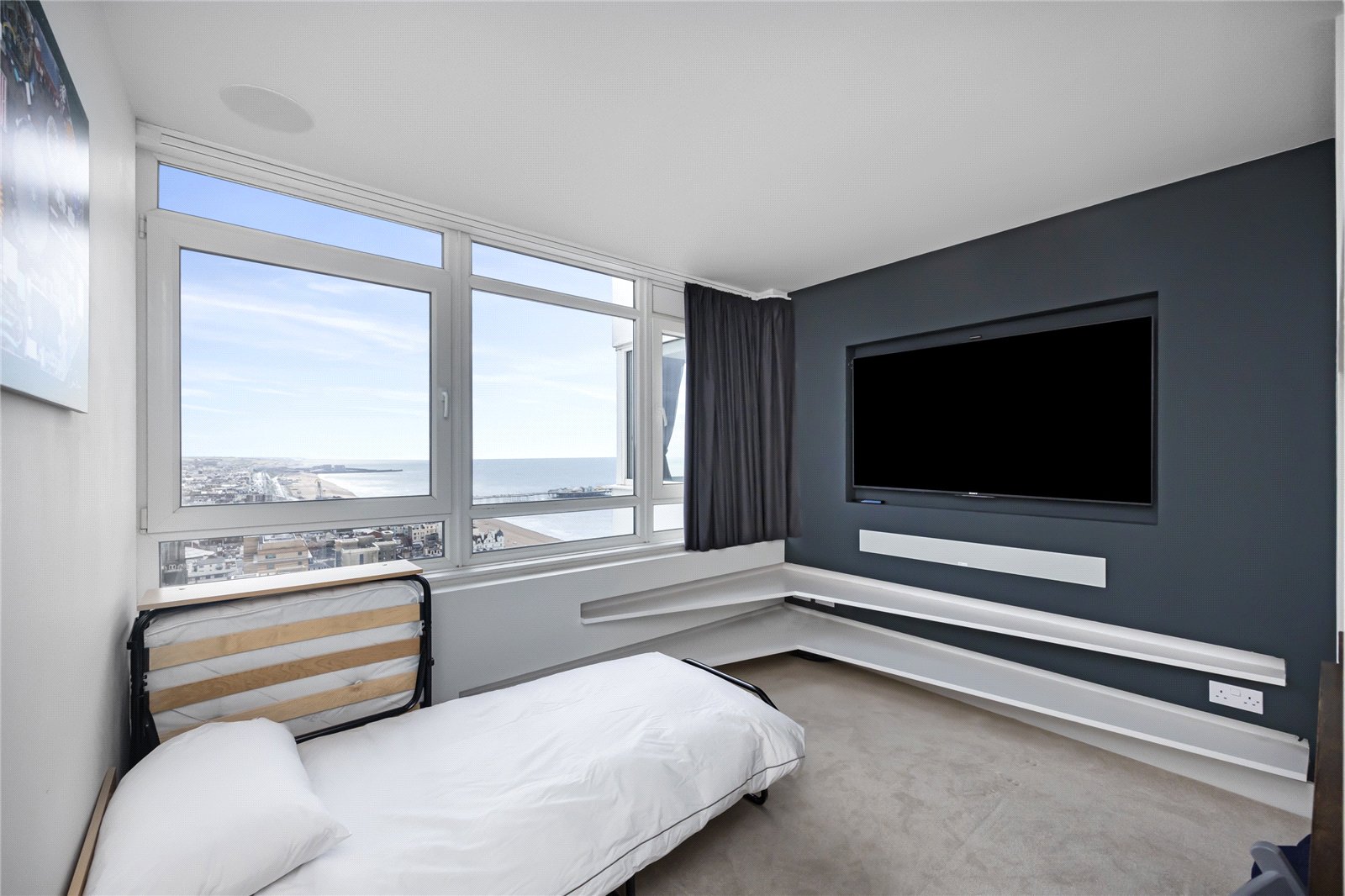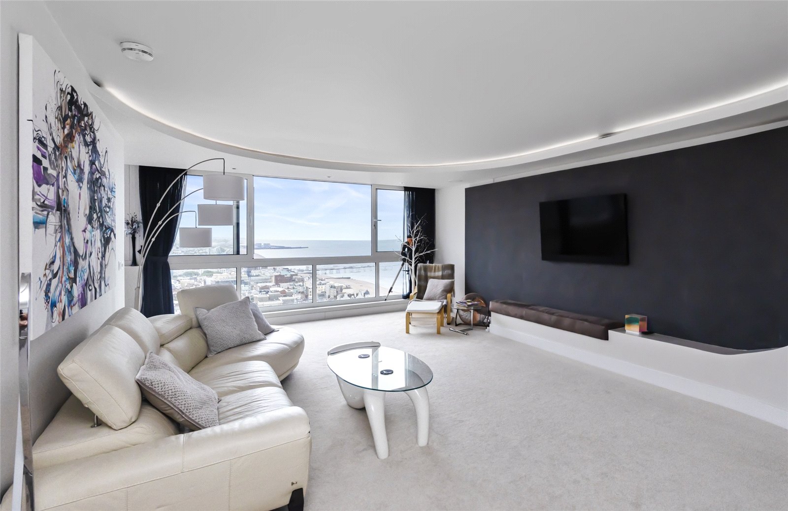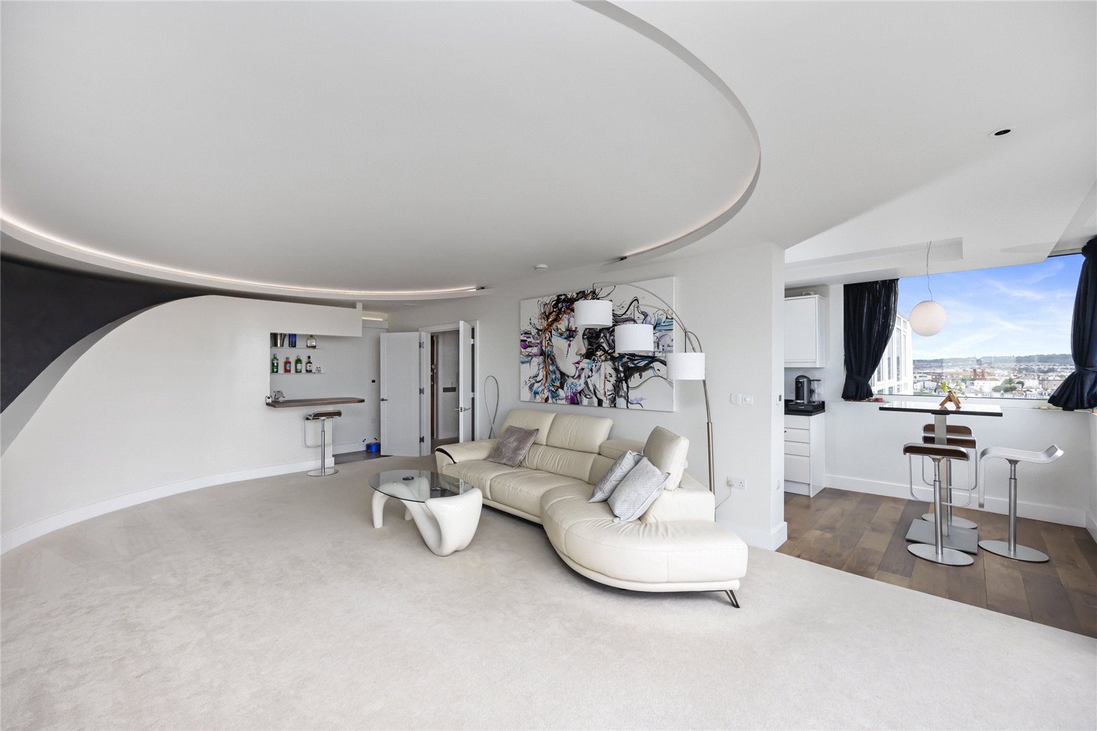 The reception room is expansive – almost 30 ft. in length – and includes a bespoke bar at one end, perfect for entertaining. With uninterrupted views across the sea and Brighton Palace Pier. The kitchen is fully fitted with top-of-the-range integrated appliances and a dedicated dining area comfortably seating four. From here, the outlook shifts, offering a stunning panorama of the Downs. Throughout the property the lights, heating and blinds in the bedrooms can be controlled by the Alexa app which also offers colour and mood lighting, all at the word of ‘Hey Google’.
