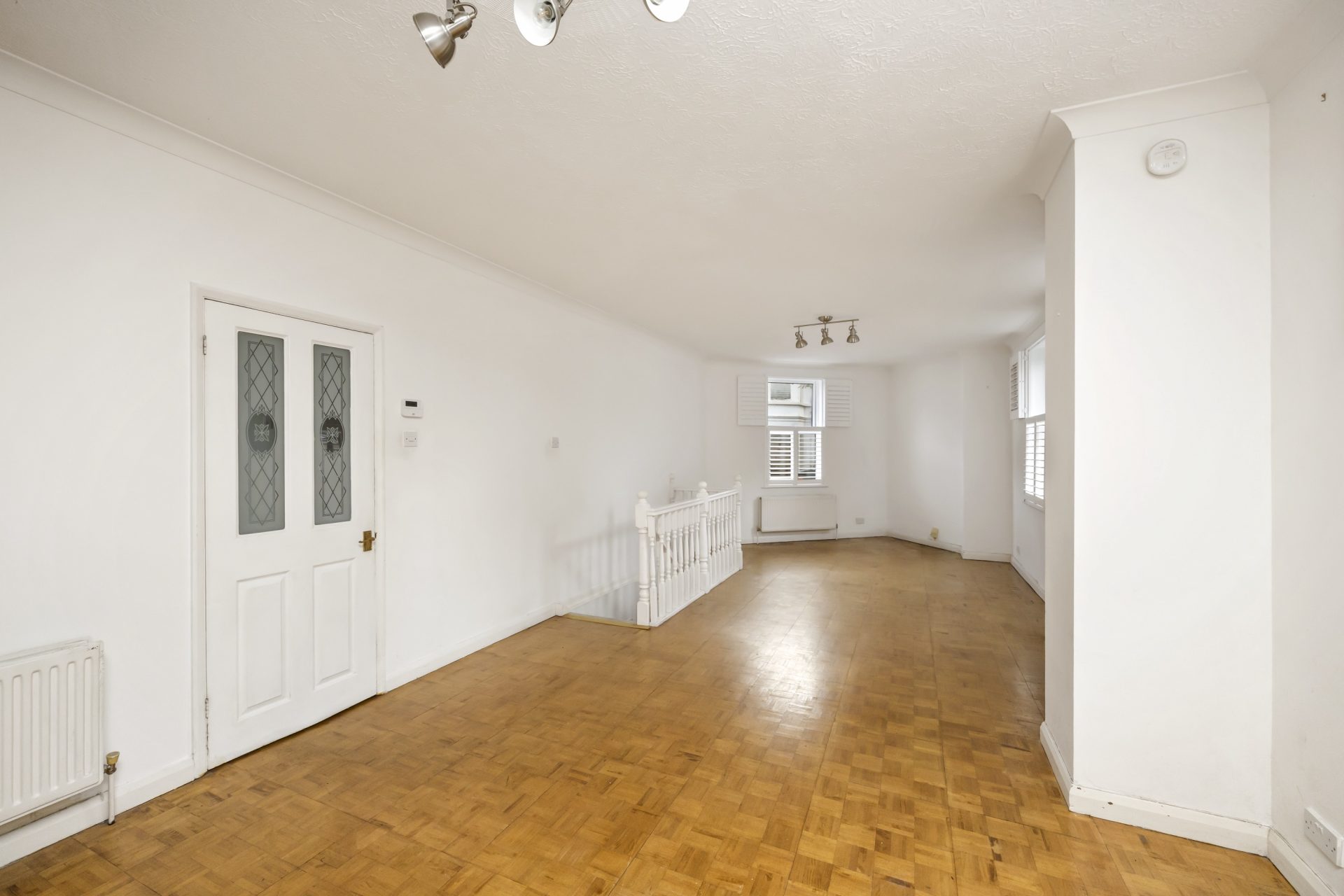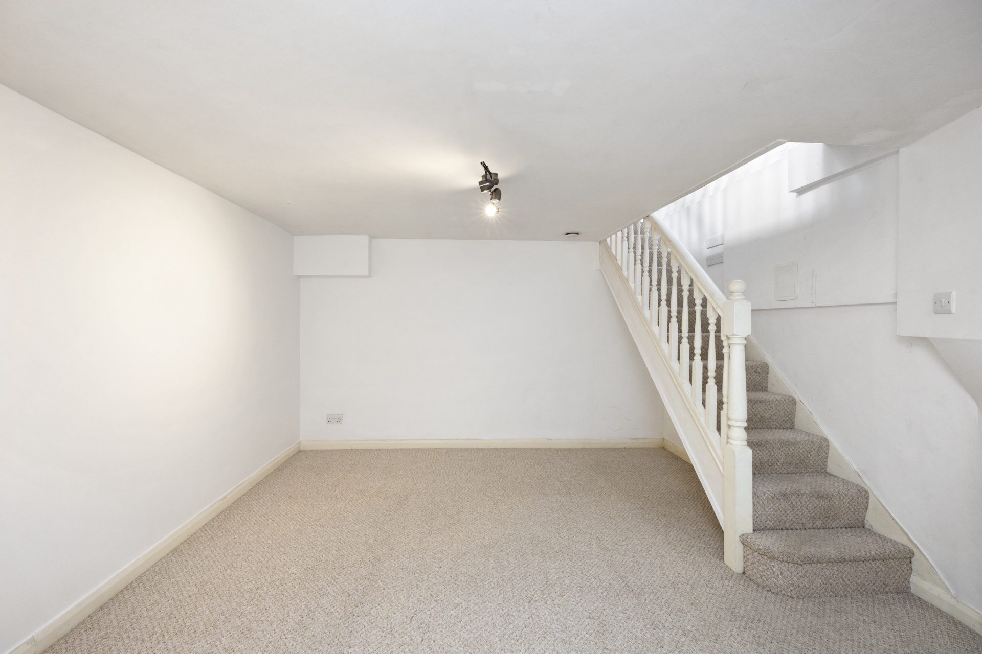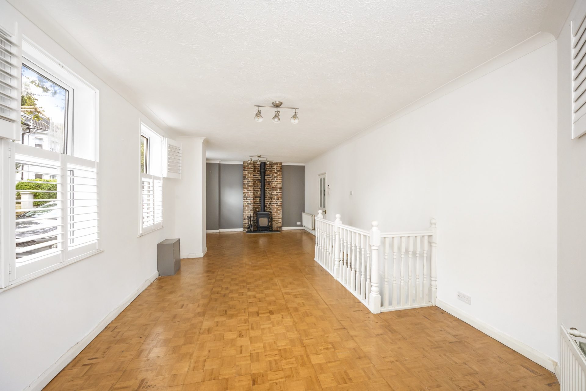 The highlight of the property is the stunning 30ft reception room, where windows run the full length of the side, flooding the space with light. At one end sits an exposed brick chimney with log burner, creating a cosy focal point, while in the center, stairs lead down to a versatile enclosed room. Perfect as a music or cinema room, it could equally serve as a children’s playroom or home office.