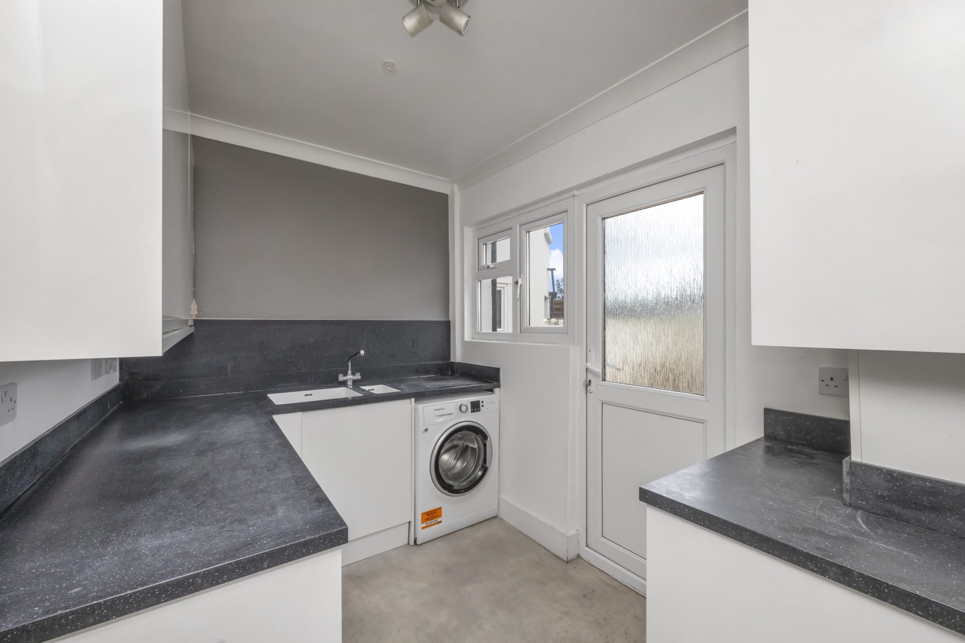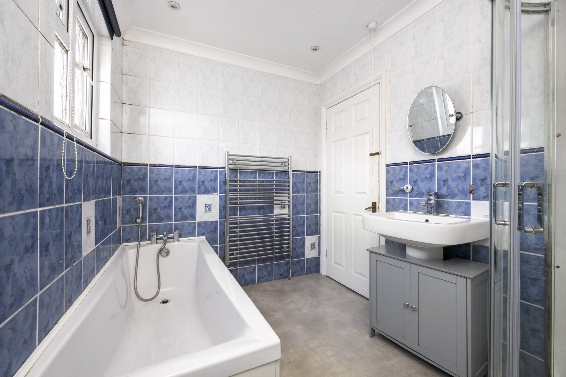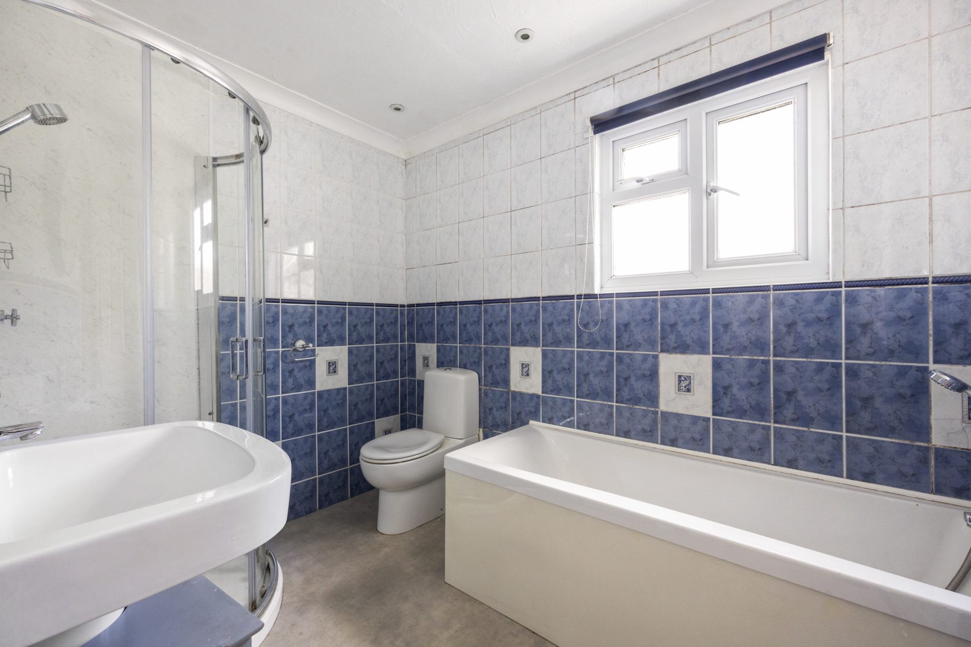 The kitchen is generously sized and fully functional, though like the bathroom offers scope for modernisation to suit personal taste. To the rear, a private garden features a handy side gate and a built-in shed, providing both convenience and storage. Upstairs, three bedrooms are set off a long hallway, which itself offers space for a reading nook or snug at the far end. The family bathroom is well-proportioned, complete with a separate shower and bath, and filled with natural light from a large window. There is also potential to extend into the loft (subject to planning consent), creating a substantial fourth bedroom with en-suite and far-reaching views.